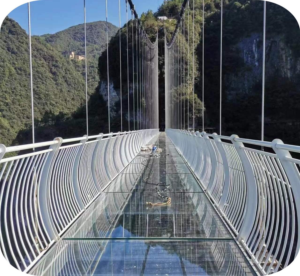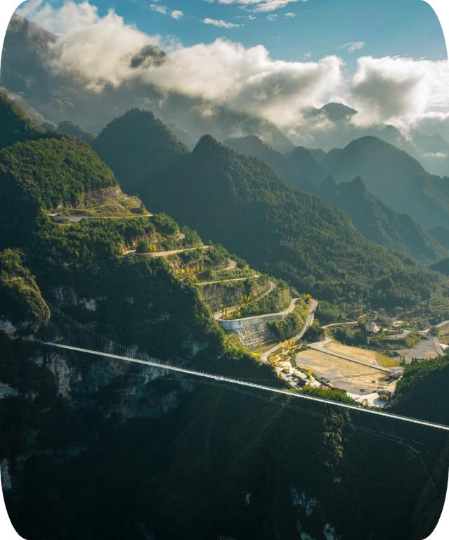 巴山玻璃吊桥位于四川省达州市宣汉县巴山大峡谷,桥梁跨度680米,落差380米,可同时容纳500人,是目前国内最长、落差最大的玻璃桥,具有显著的工程和旅游价值。